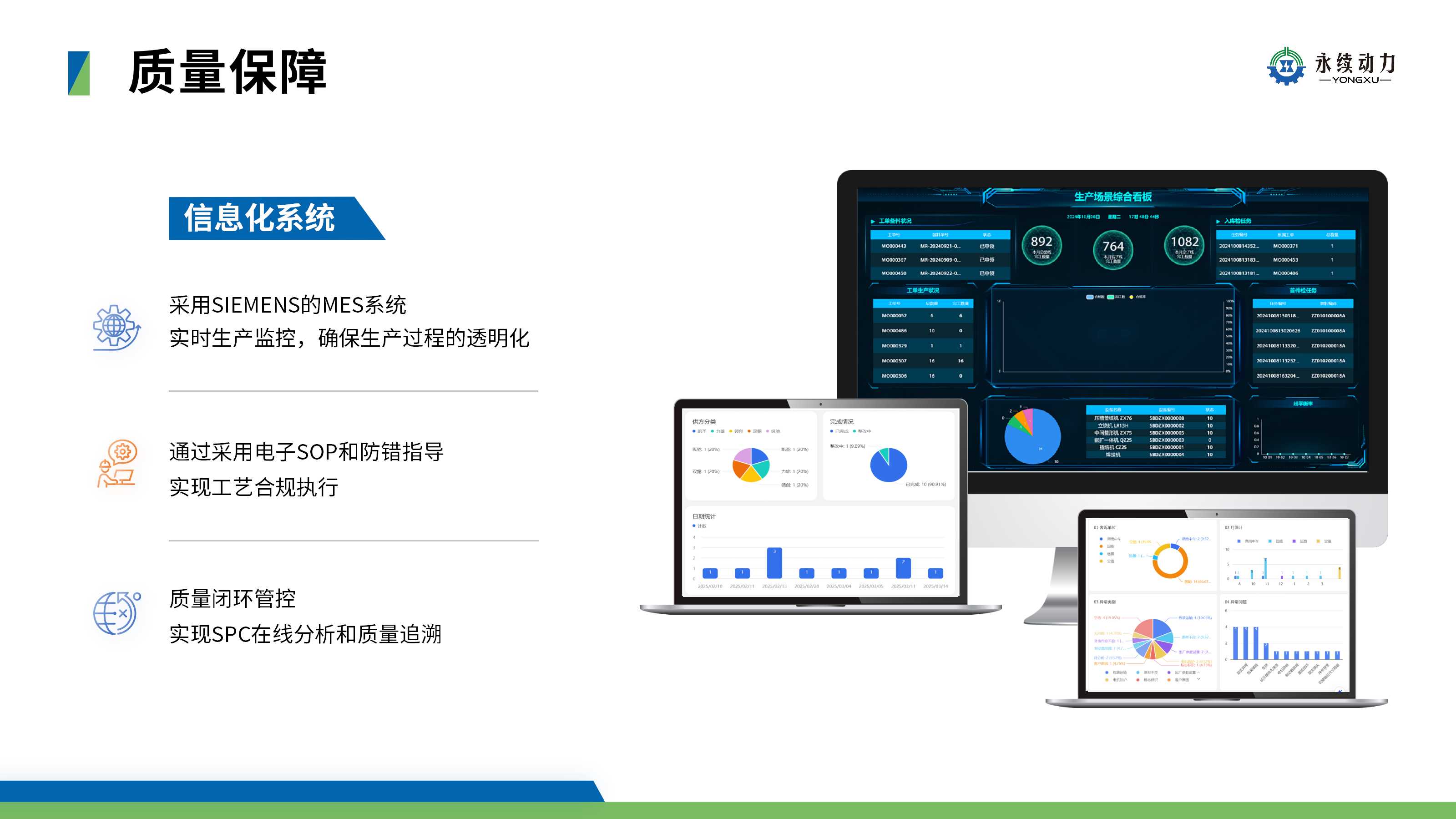 质量检测共拥有全自动三座标、拉压力试验机、偏摆测试仪、电阻仪、安规测试仪、绝缘表、电机测试系统、驱动器测试系统等检验方案,采用SIEMENS的MES系统实时生产监控,确保生产过程的透明化;通过采用电子SOP和防错指导实现工艺合规执行;质量闭环管控实现SPC在线分析和质量追溯。